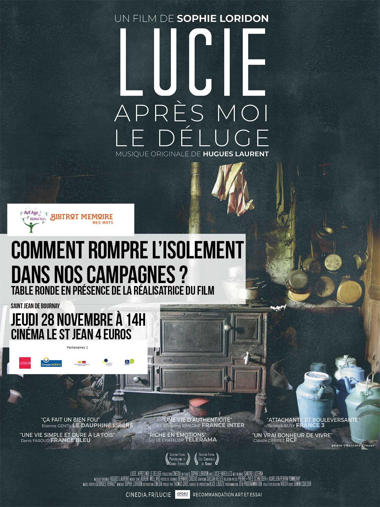 – Bistrot Mémoire – Interview Véronique Boulieu – Dans le cadre du projet Bistrot Mémoire, l’association Art’Age et Alchim’Aide vous propose, le jeudi 28 novembre 2019 à 14h00 au Cinéma Le St-Jean à Saint Jean de Bournay, la projection du film après moi le déluge de Sophie Loridon qui sera suivi d’une table ronde en présence de la réalisatrice sur le thème “Comment rompre l’isolement dans vos campagnes?”. Explications Delphine Moras, anthropologue et chargée de projet.