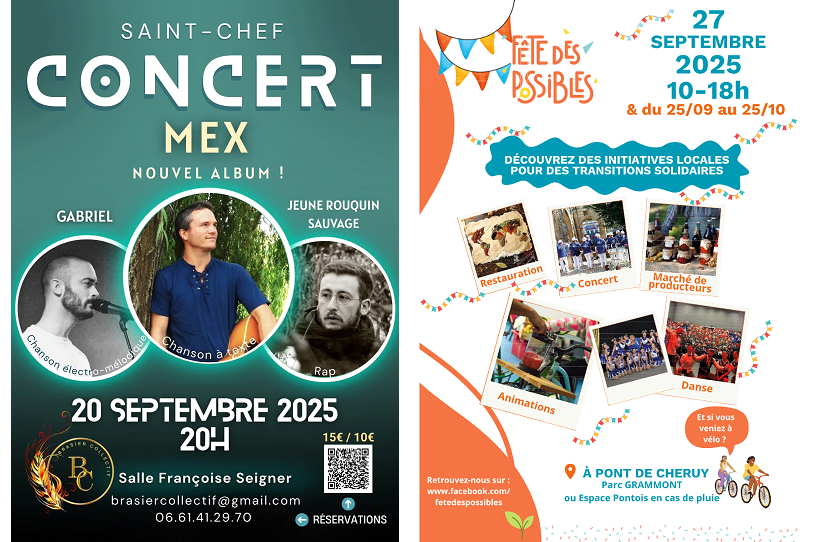 Le Brasier Collectif qui organise un concert à la salle Françoise Seigner à Saint Chef en Dauphiné le samedi 20 septembre 2025 à 20h00. Elle recevra Mathieu Foulu-Mion, alias Mex, Sylvain Gabriel, alias Gabriel et Adrien Françon, alias Jeune rouquin sauvage. Dans la deuxième partie, elle accueillera Catherine Bodet, membre du collectif la Fête des possibles qui viendra nous présenter la fêtes des possibles qui aura lieu sur le territoire des Balcons du Dauphiné et de la LYSED du 25 septembre au 25 octobre 2025, avec une grande journée au Parc Grammont à Pont de Cheruy le samedi 27 septembre 2025 de 10h00 à 18h00.
