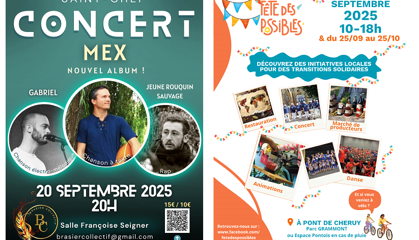 Le Brasier Collectif qui organise un concert à la salle Françoise Seigner à Saint Chef en Dauphiné le samedi 20 septembre 2025 à 20h00. Elle recevra Mathieu Foulu-Mion, alias Mex, Sylvain Gabriel, alias Gabriel et Adrien Françon, alias Jeune rouquin sauvage. Dans la deuxième partie, elle accueillera Catherine Bodet, membre du collectif la Fête des possibles qui viendra nous présenter la fêtes des possibles qui aura lieu sur le territoire des Balcons du Dauphiné et de la LYSED du 25 septembre au 25 octobre 2025, avec une grande journée au Parc Grammont à Pont de Cheruy le samedi 27 septembre 2025 de 10h00 à 18h00.