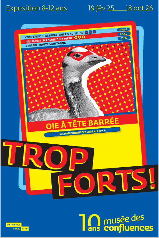 Affiche de l'exposition "trop forts!" du musée des Confluences. Le fond est bleu foncé. En haut, en jaune, est écrit "exposition 8-12 ans ; 19 février 2025/18 octobre 2026". Deux rectangle, qui figurent des cartes superposées, prennent la majeure partie de l'image. Celle qui est en dessous de l'autre a des couleurs plutôt froides (bleu clair et bleu foncé). Celle qui la surmonte est principalement rouge et jaune. A l'intérieur, dans un encadré rouge à petites étincelles jaunes, se trouve la photo du haut du corps d'une oie, en noir et blanc. On a rajouté un contour blanc à la partie droite de la photo, et un petit masque rouge autour des yeux de l'oie. Une légende indique "Oie à tête barrée, la championne des airs" ; et en haut de la photo se trouvent des statistiques. Dans deux cadres noirs, placés par dessus le bas de la carte, le titre de l'exposition : "Trop forts!". En bas à gauche, en petit et en jaune, le logo "Métropole du Grand Lyon". Et enfin, en bas à droite, toujours en jaune mais un peu plus gros, un logo indique "10 ans musée des Confluences".
