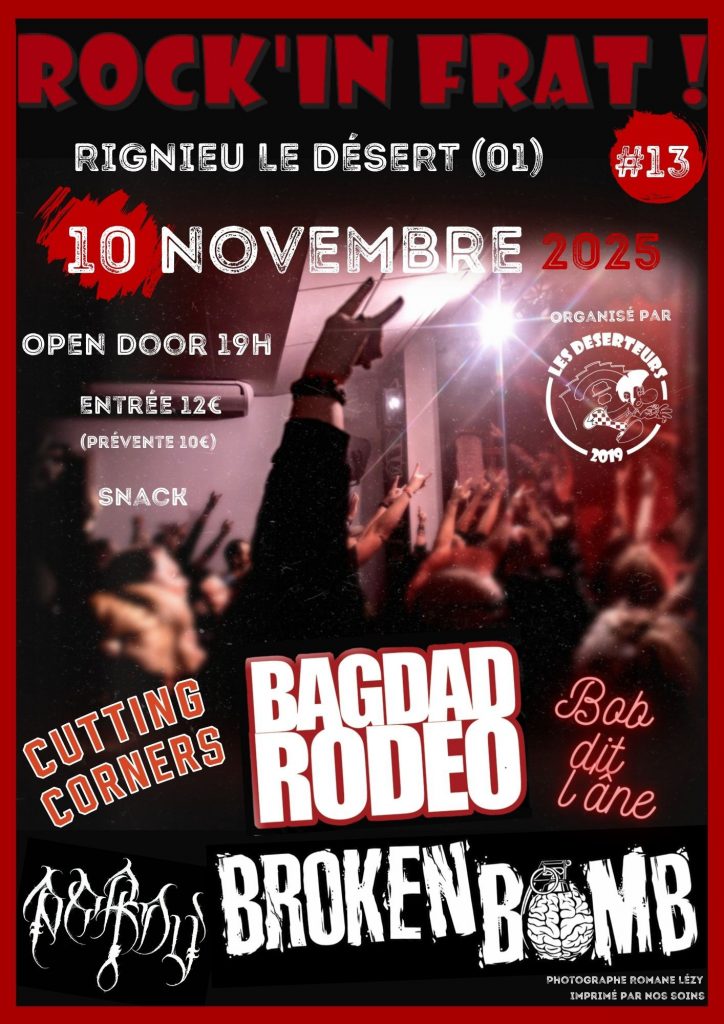 Invités: Daniel, et Jean-Luc membres de l’association, “les Déserteurs”, Festival ROCK IN FRAT (13ème Edition), Rignieu le Désert (Ain), le 10 Novembre. ITW Cristobal, membre Bagdad Rodéo. Nous avons écouté: Perdu: Les autres, Victime, Qatar connexion – Cutting Corners: Day Light, I’m ok, Transpoline – Bagdad Rodéo: Le dernier communiste, Révolution Vendetta, Co2ncard.