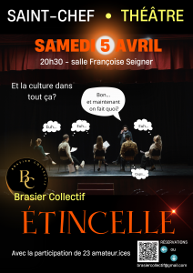 L’association le Brasier Collectif, dont le siège social est à Saint Chef en Dauphiné, a vu le jour en 2023. Son but, promouvoir la culture sur le territoire des Balcons du Dauphiné. Le samedi 5 avril 2025, à la salle Françoise Seigner à Saint Chef en Dauphiné, elle vous propose une pièce de Théâtre Étincelle avec la participation de 24 amateurs. Sylvain Gabriel, artiste et membre de l’association nous présente l’association et cette soirée. www.facebook.com/profile.php?id=100092537840479