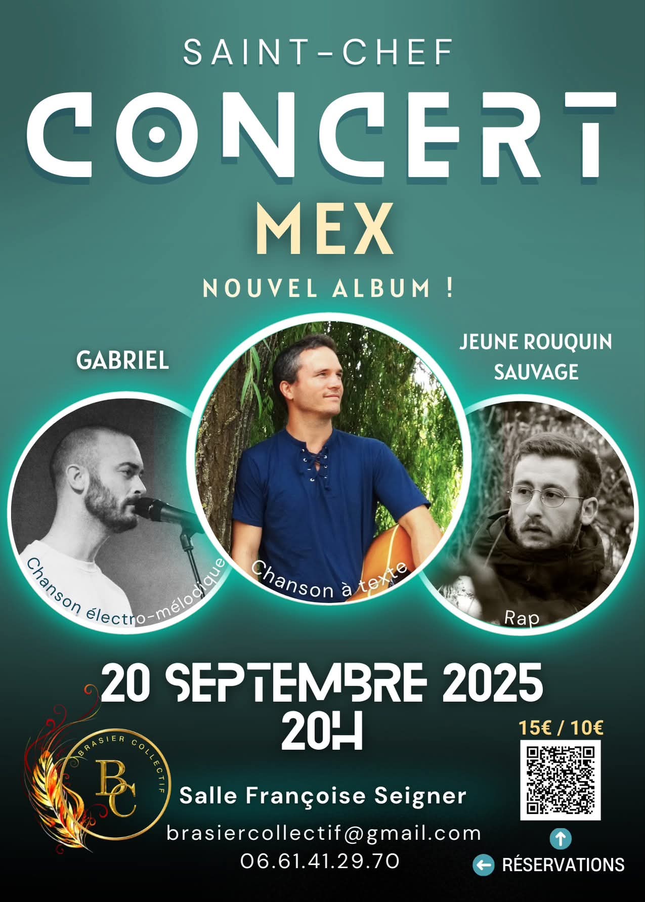 L’association Le Brasier collectif a vu le jour à Saint Chef en Dauphiné en 2023. Elle est soutenue par la commune qui souhaite fédérer les artistes professionnels locaux et promouvoir la culture sur le territoire de la commune et par extension sur les Balcons du Dauphiné. L’association organise un concert à la salle Françoise Seigner à Saint Chef en Dauphiné le samedi 20 septembre 2025 à 20h00, pour la sortie du 3ème album de Mex, auteur , compositeur et interprète. Mathieu Foulu-Mion, alias Mex, Sylvain Gabriel, alias Gabriel et Adrien Françon, alias Jeune rouquin sauvage nous présentent leurs projets.